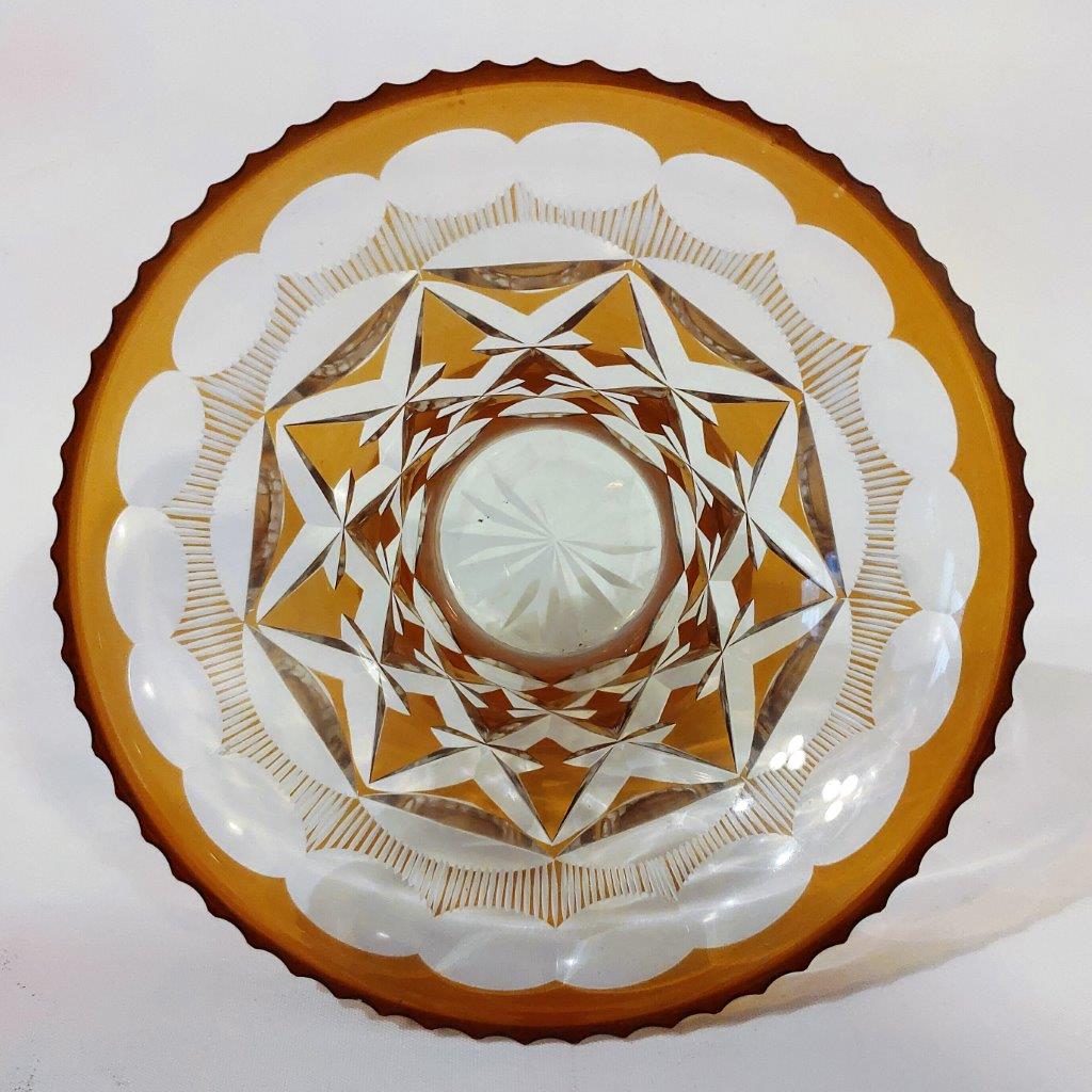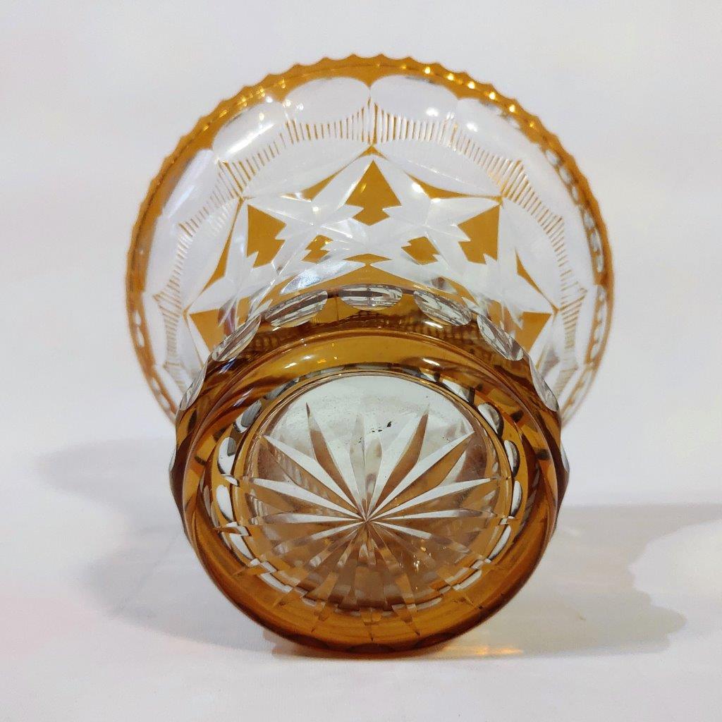 Popis: Váza menších rozměrů, ambrové sklo vrstvené na číré sklovině s bohatým výbrusem