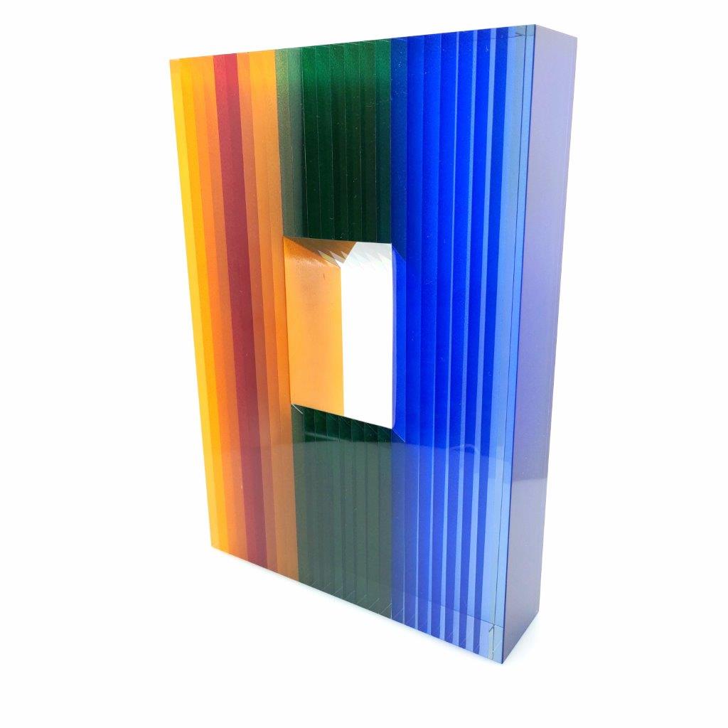 Popis: Autorská plastika, vrstvené vertikální skleněné desky obarvené červenou, žlutou, zelenou a modrou lazurou. Zakoupena z aukčního domu v USA