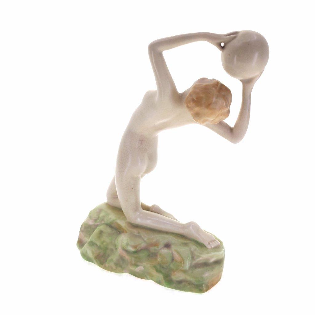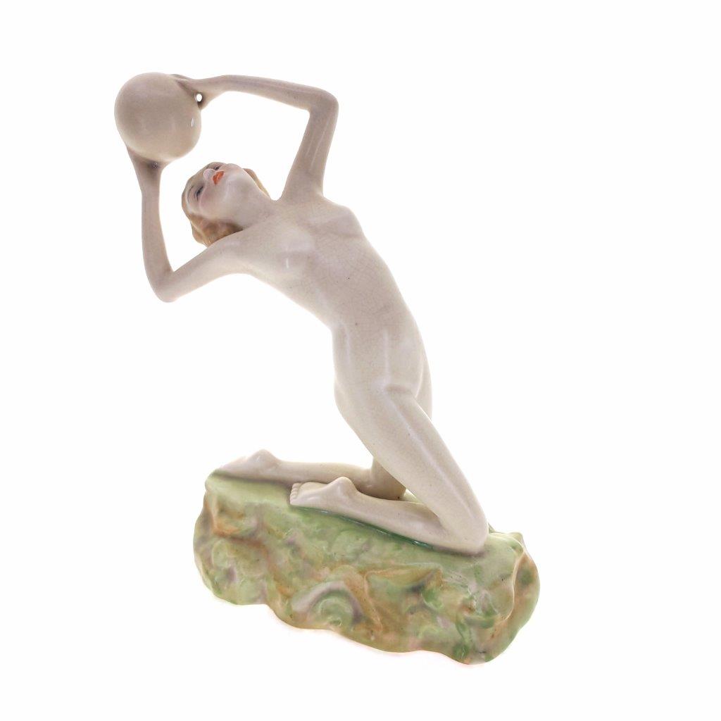 Popis: Akt ženy v záklonu s míčem, biskvit v kombinaci s naglazurovými barvami, číslo modelu 173