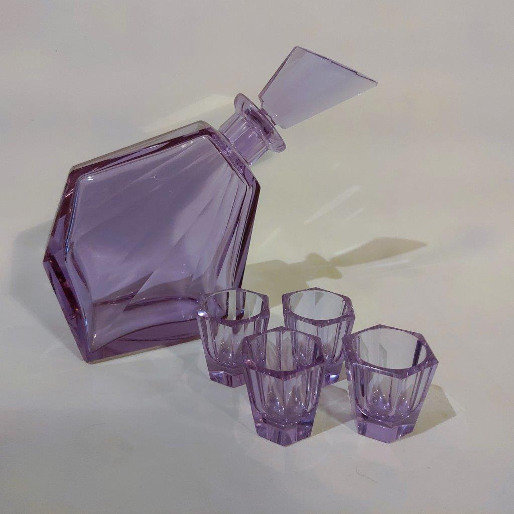 Popis: Likérový set – karafa a čtyři štamprle. Lité broušené sklo ametystové barvy ve stylu Art Deco, souprava byla navržena designérem Rudolfem Eschlerem