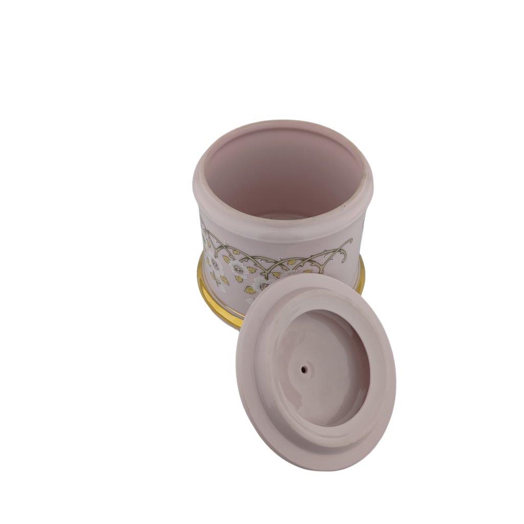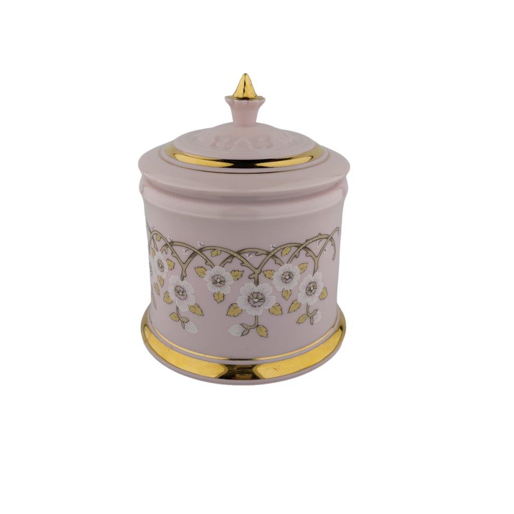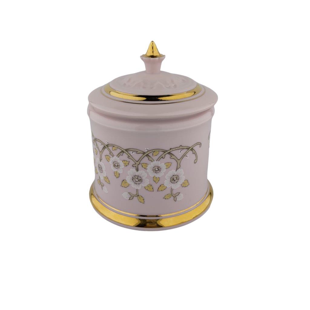 Popis: Dóza s víkem, růžový porcelán se zlacením a květinami