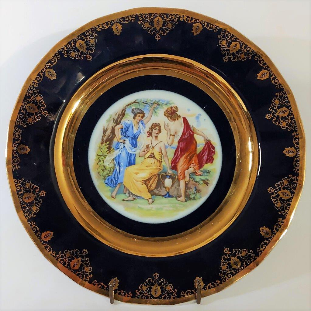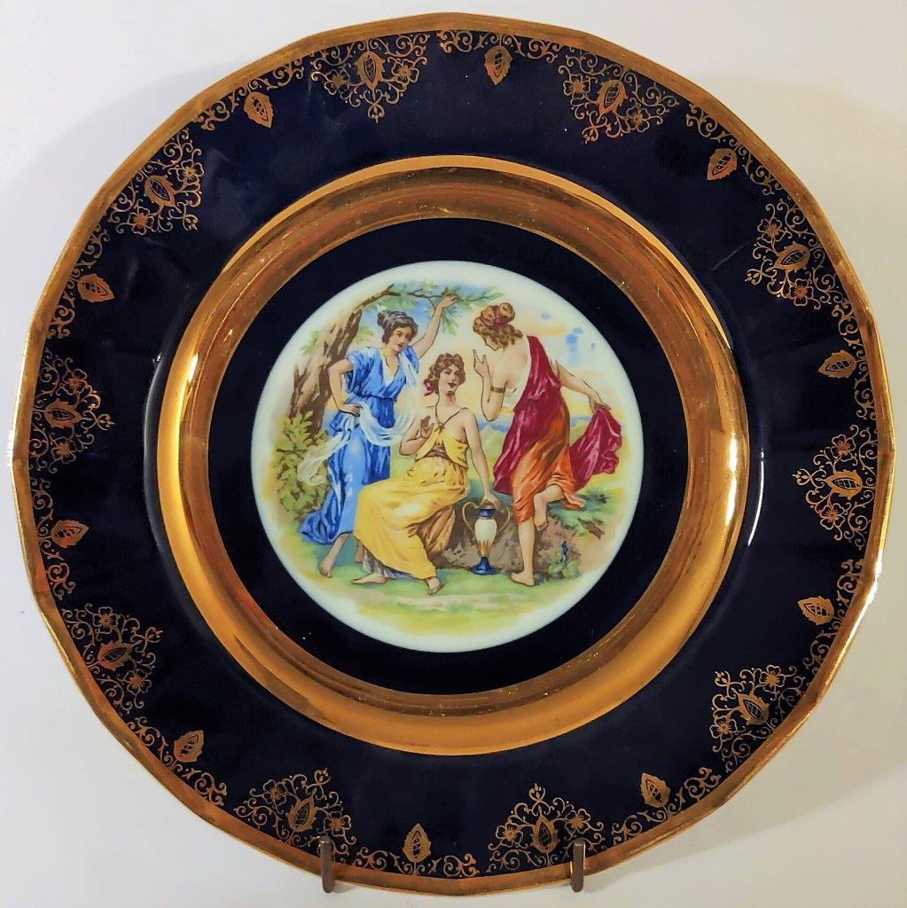 Popis: Závěsný talíř tři grácie, kobaltová glazura se zlatým dekorem