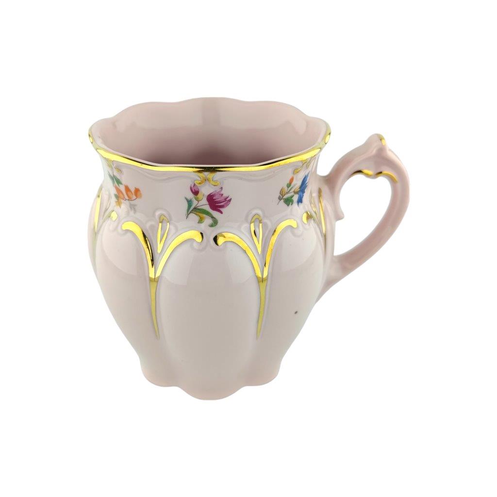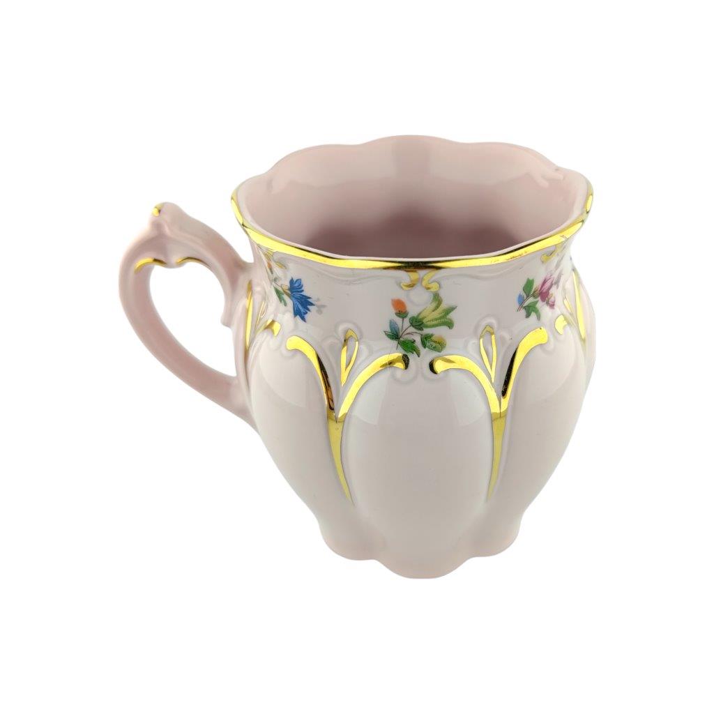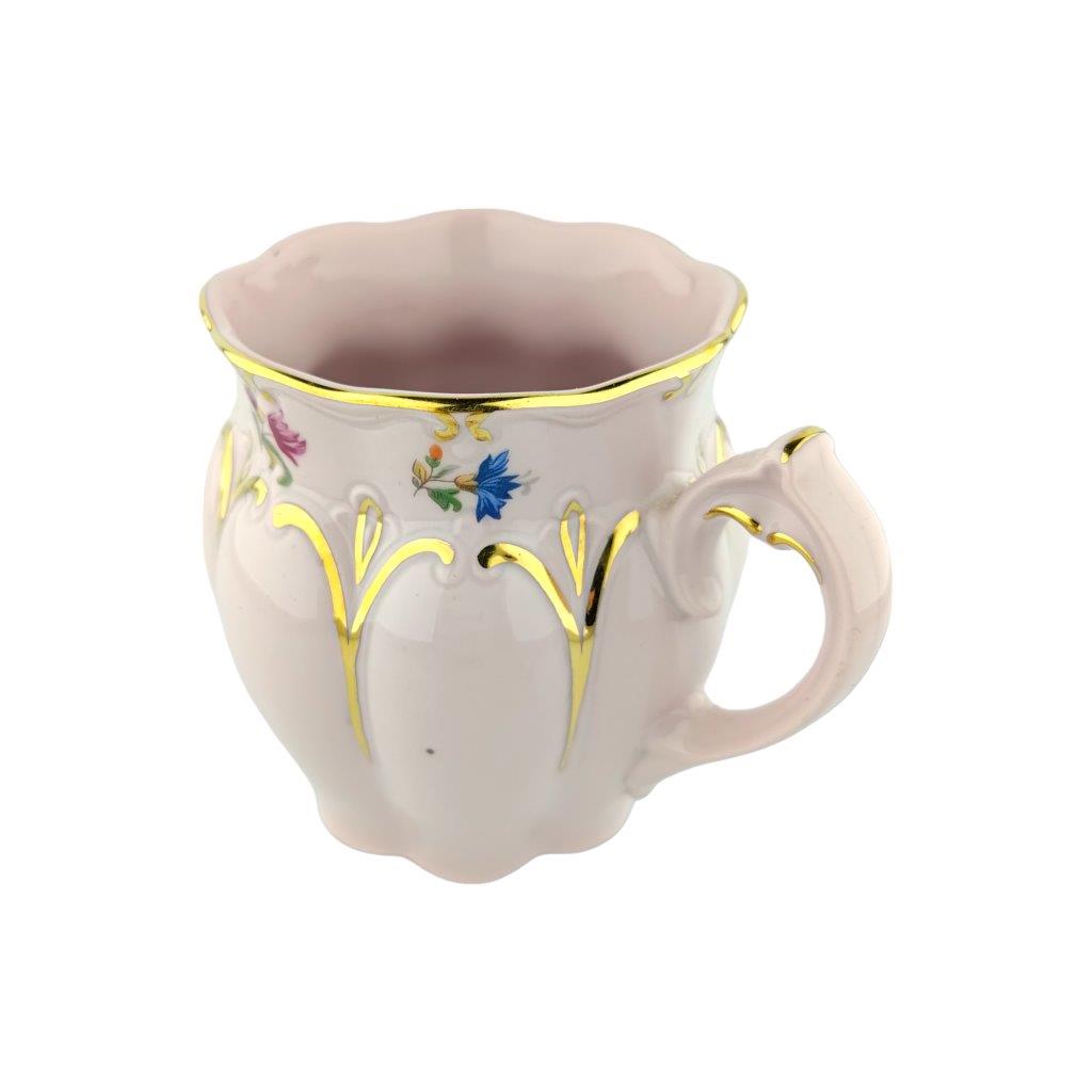 Popis: Hrnek s květinovým dekorem a jemným zlacením, růžový porcelán
