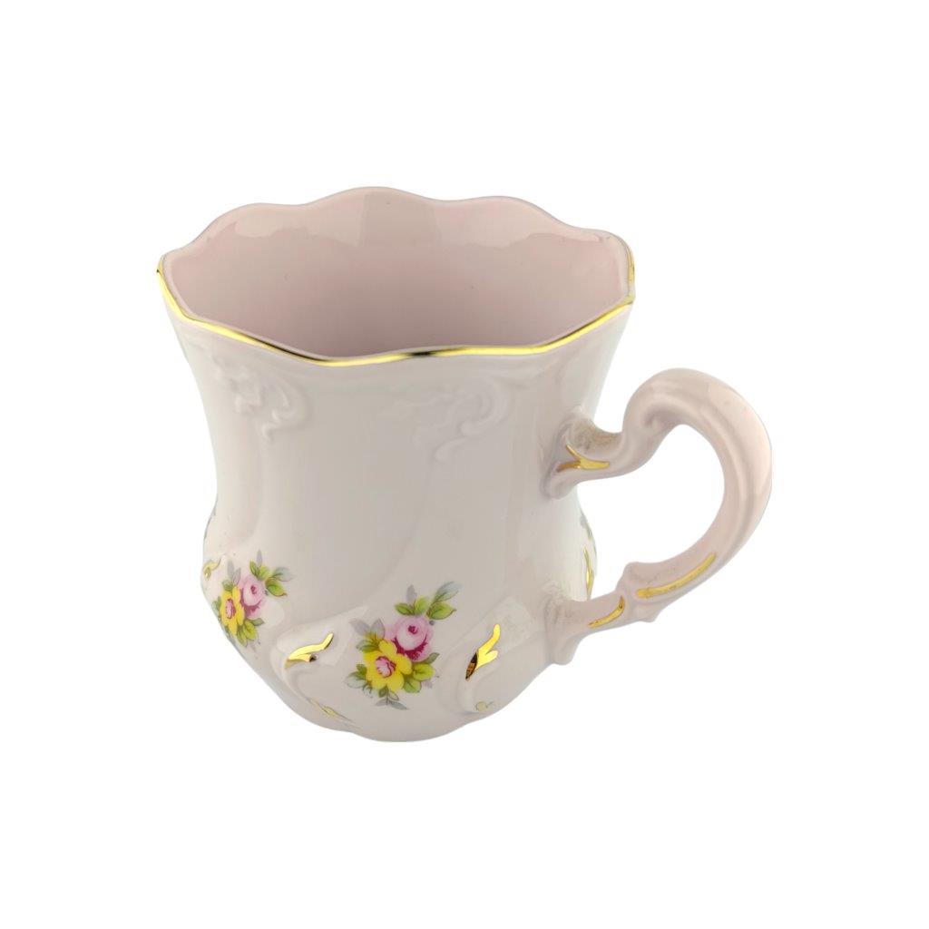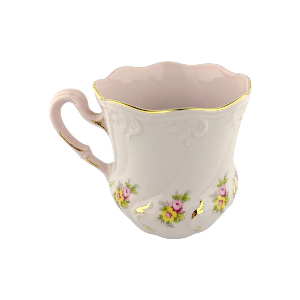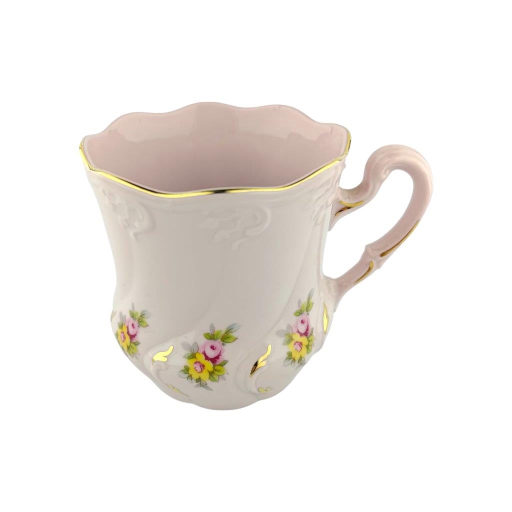 Popis: Hrnek s květinovým dekorem po stranách a jemným zlacením, růžový porcelán