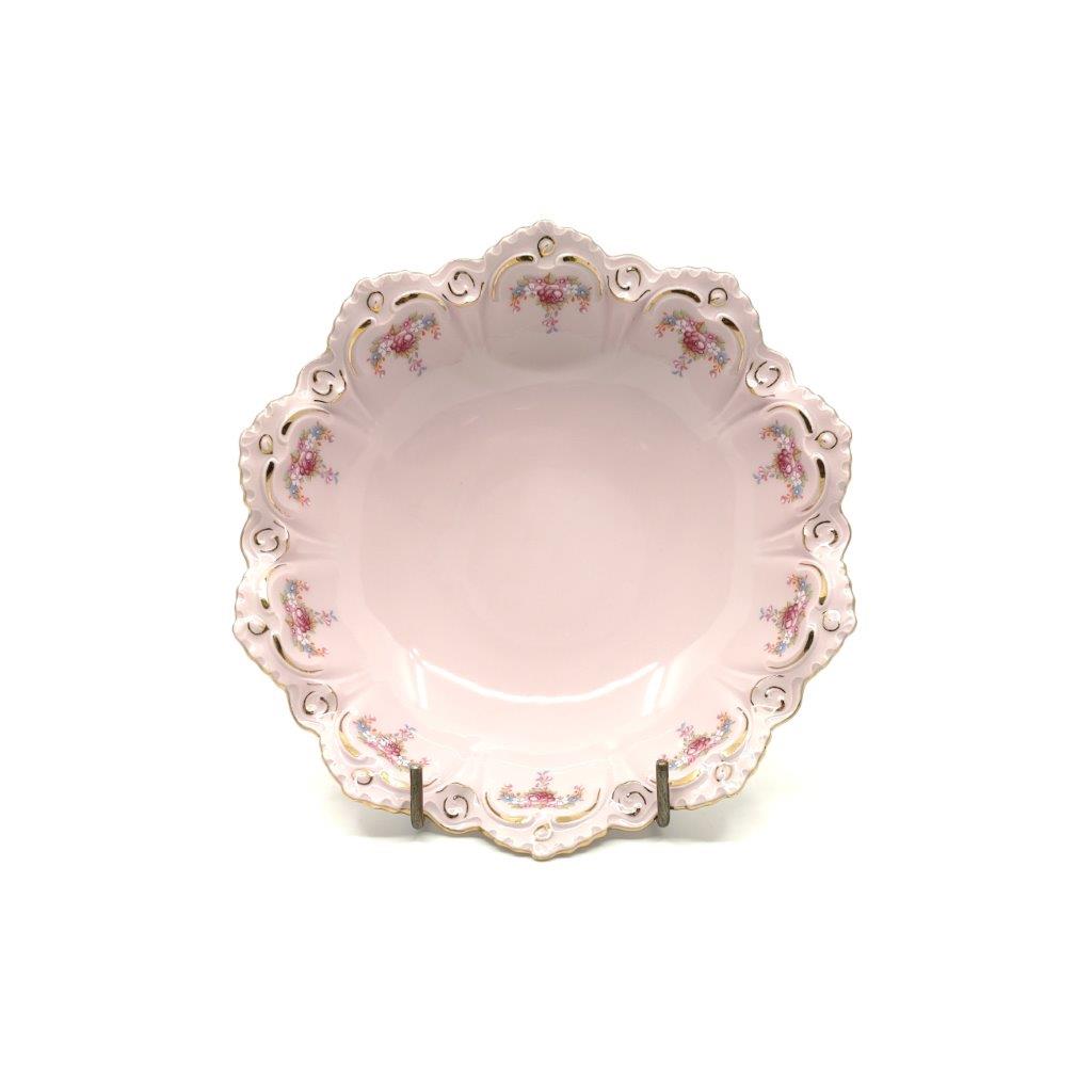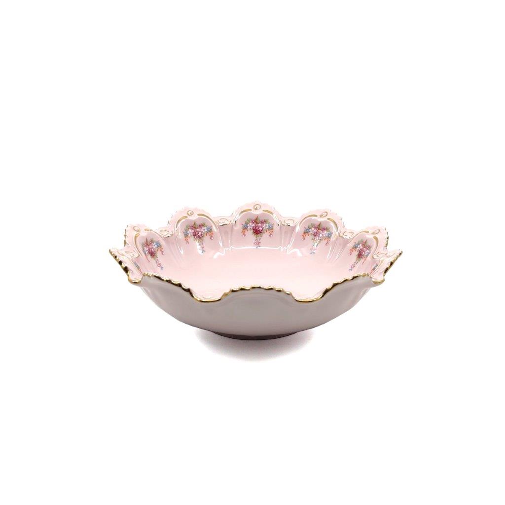 Popis: Miska na kompot s květinovým motivem a jemným zlacením, růžový porcelán