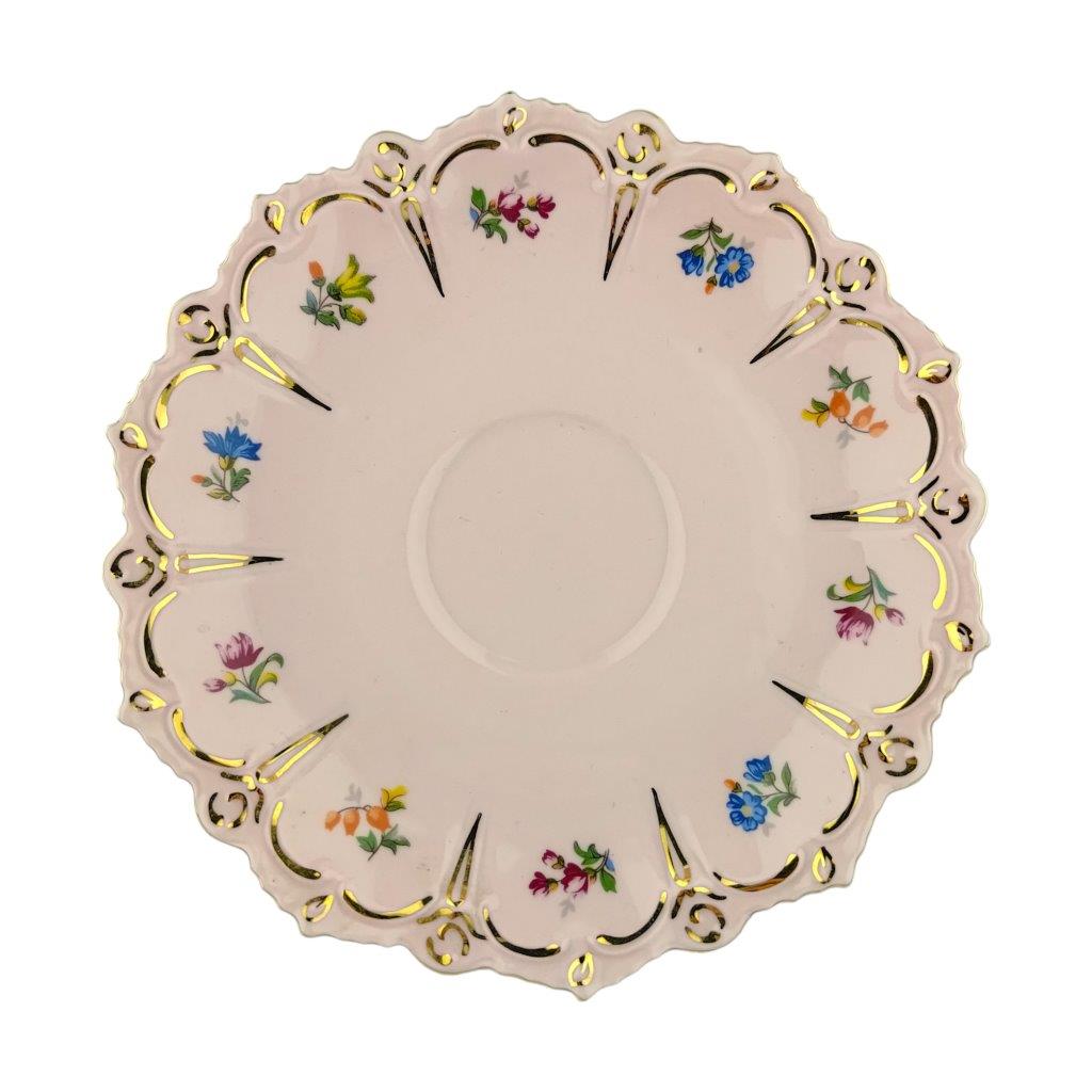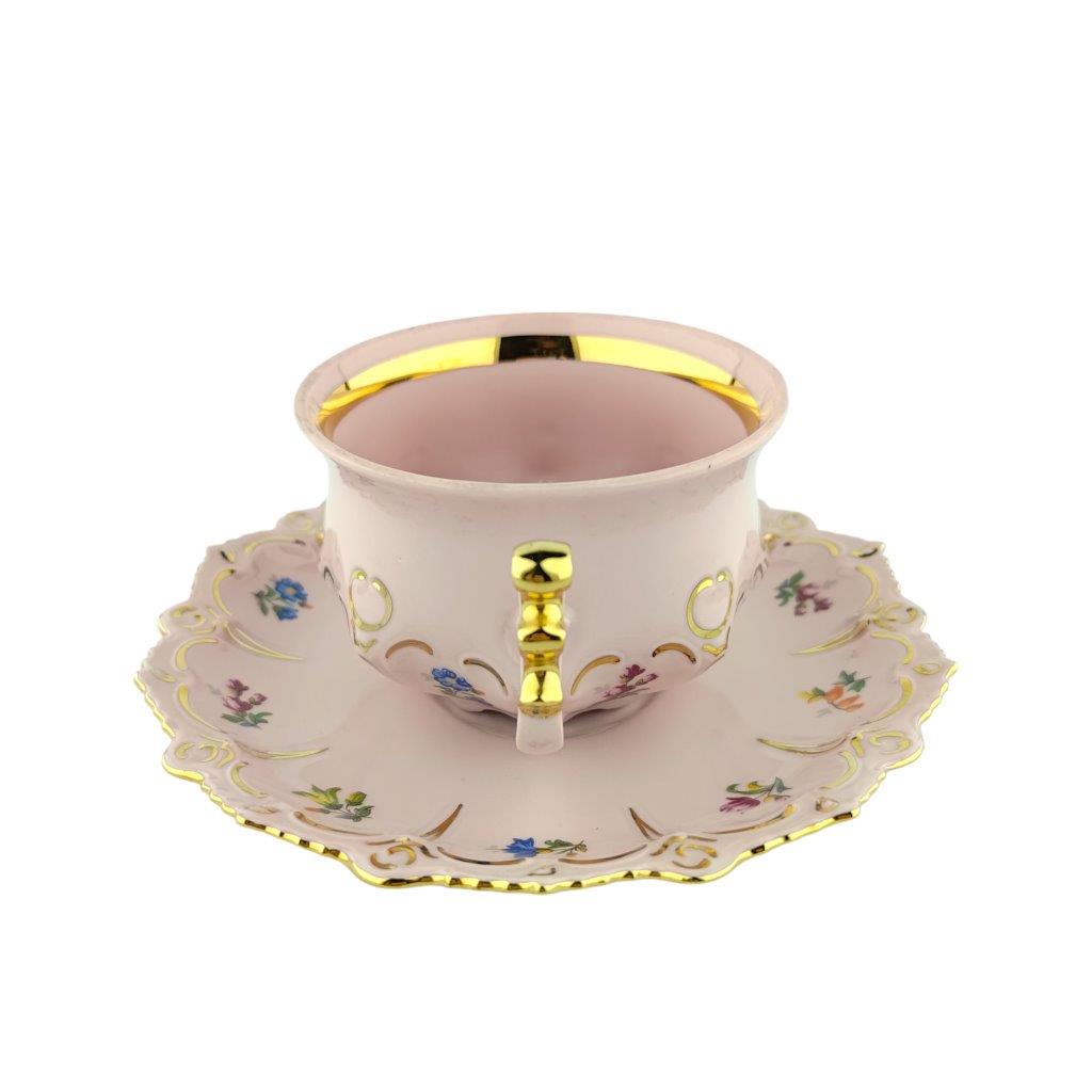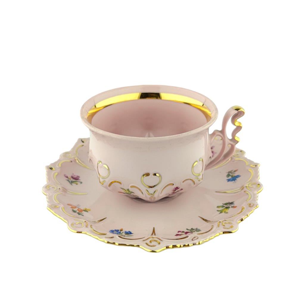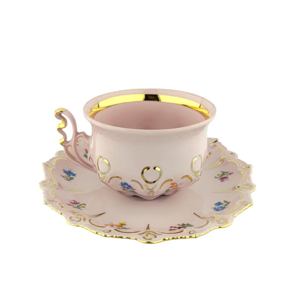 Popis: Šálek a podšálek čajový, růžový porcelán s květinovým dekorem a zlacením, model Lenka