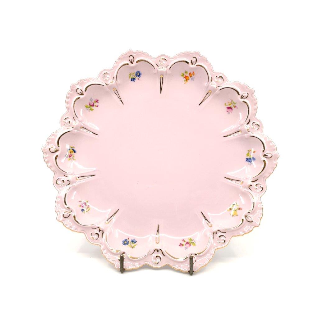 Popis: Talíř mělký s květinovým motivem a jemným zlacením, růžový porcelán, model Lenka