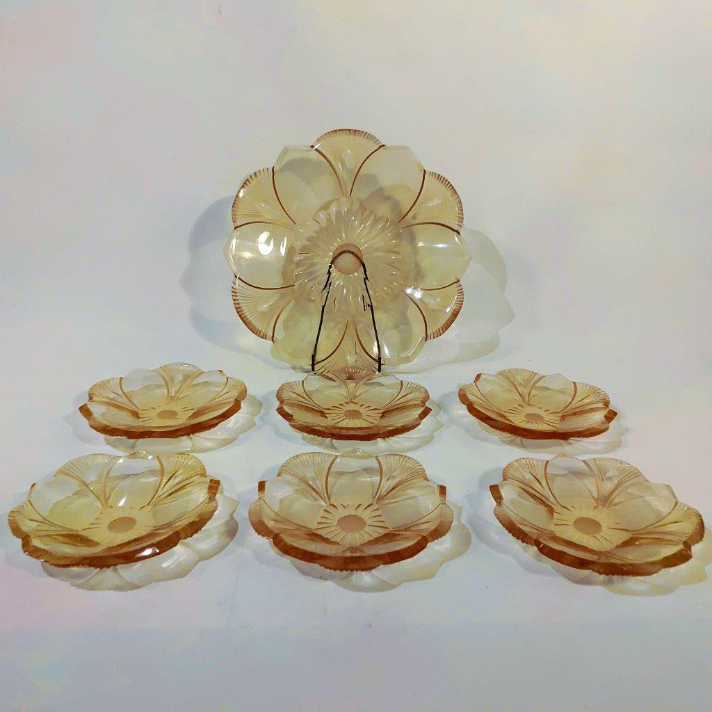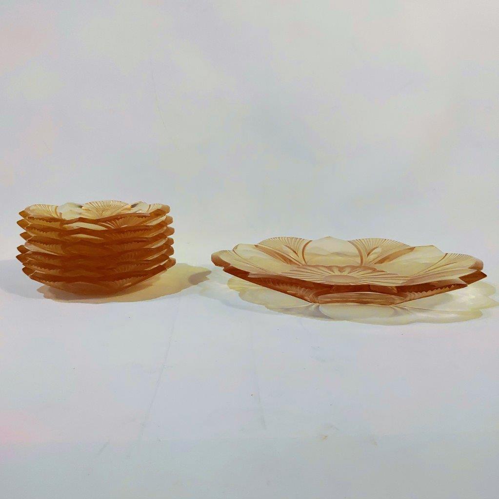Popis: Dezertní souprava, lisované sklo v barvě amber, květinový výbrus na dně. Obsahuje: šest malých talířků a jeden velký tác