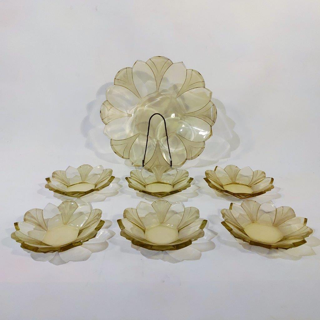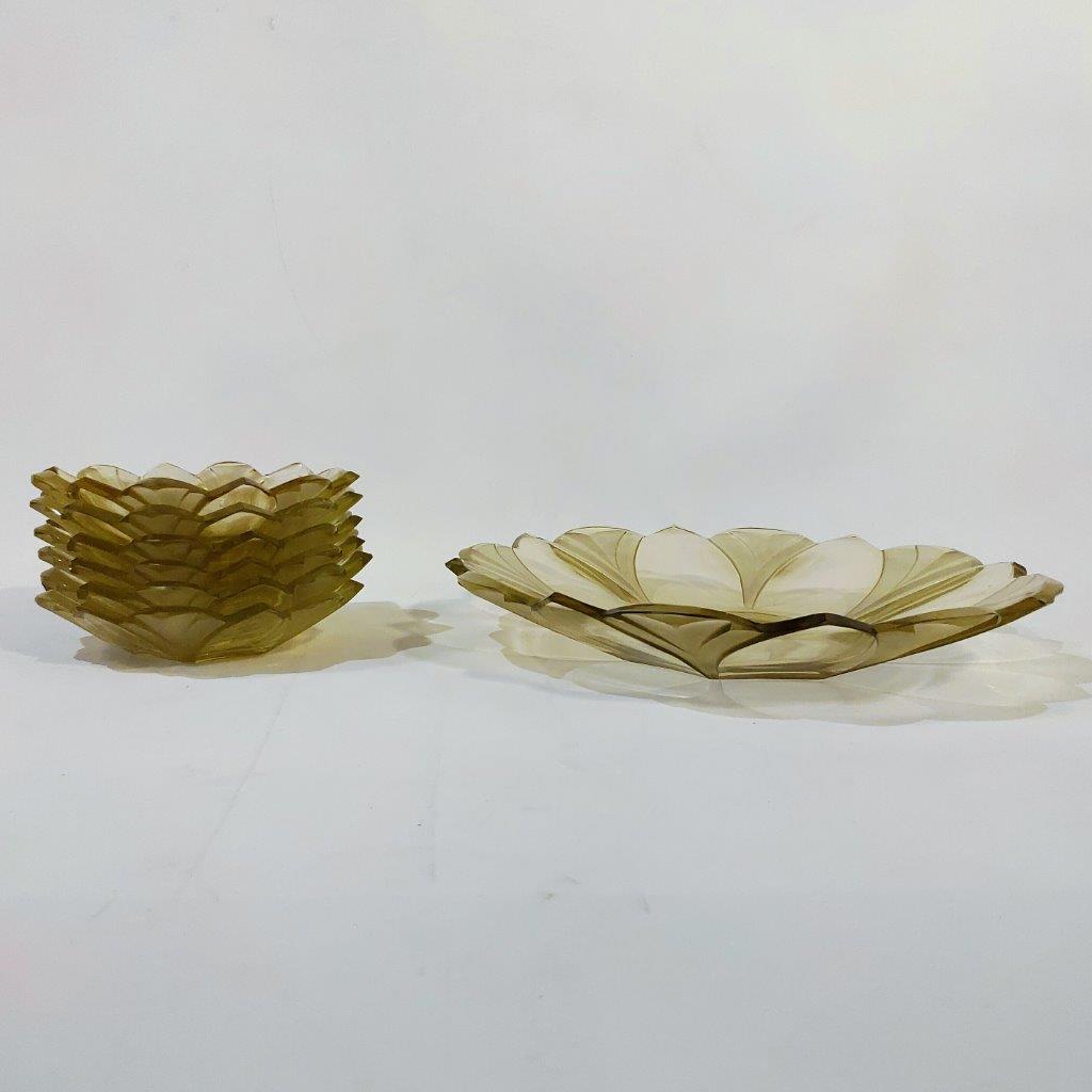 Popis: Dezertní souprava, lisované sklo v citrínové barvě, květinový výbrus na dně. Obsahuje: šest malých talířků a jeden velký tác