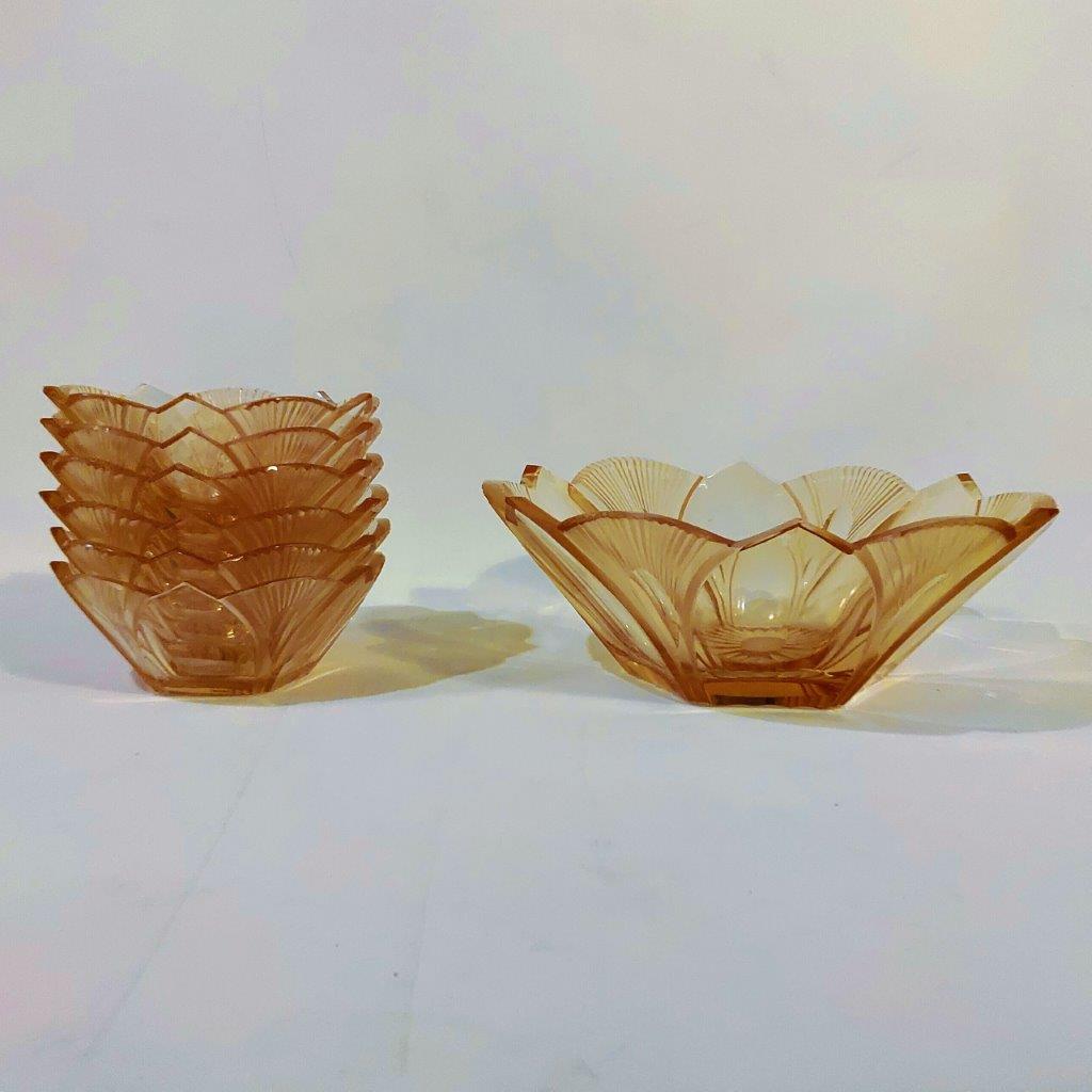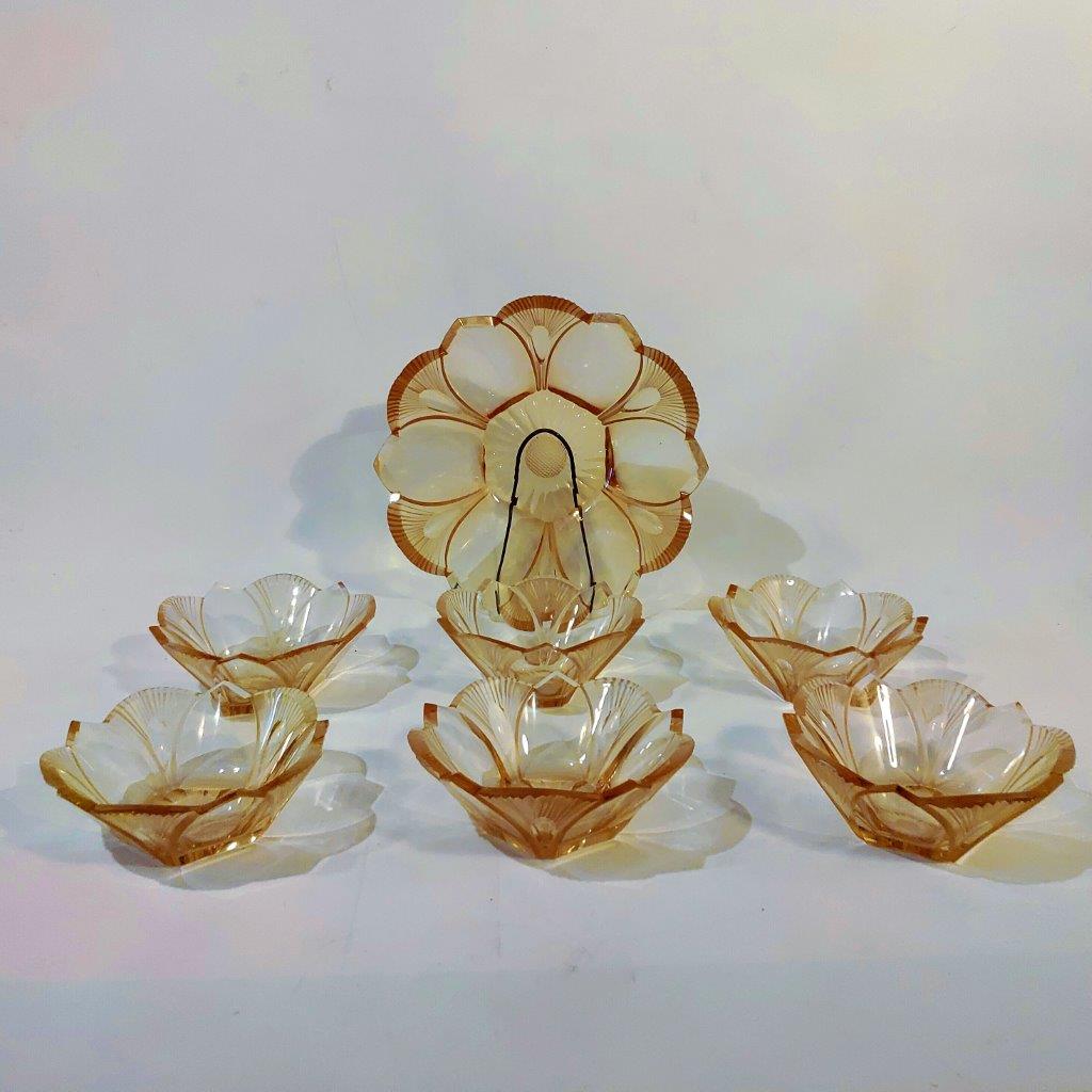 Popis: Kompotová souprava, lisované sklo v citrínové barvě, květinový výbrus na dně. Obsahuje: šest malých misek a jednu velkou mísu