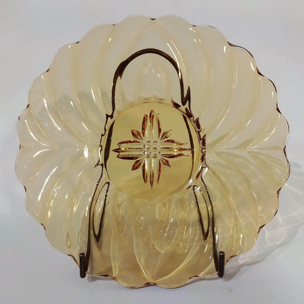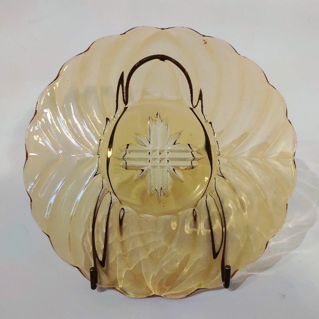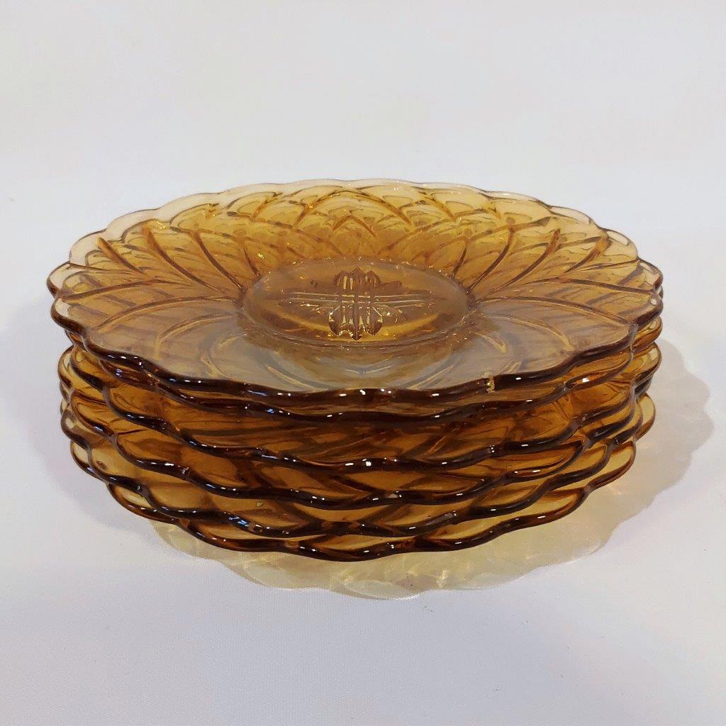 Popis: Dezertní malé talíře – šest kusů, lisované sklo v barvě amber, výbrus na dně