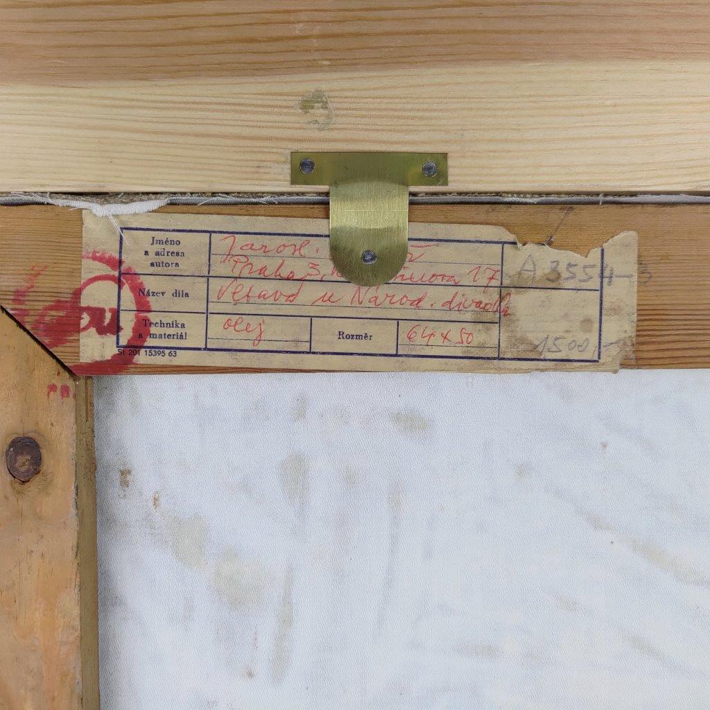 Popis díla: Pohled na Národní divadlo a most Legií z Vltavy, lehce impresionistická malba. Na obraze se nachází ještě bývalá Žofínská plovárna, která fungovala do 50. let minulého století. Na zadní straně štítek autora.