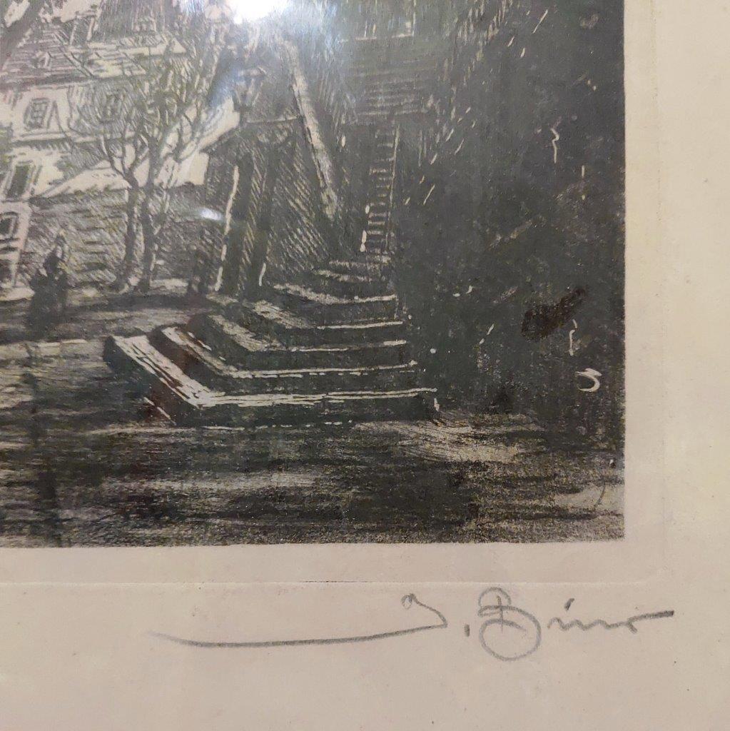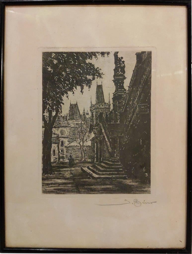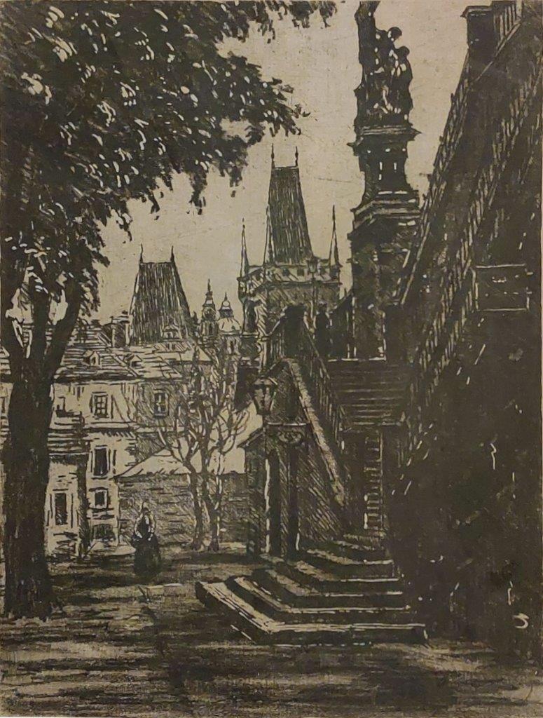 Popis díla: Pohled na schody Karlova mostu a Malostranskou mosteckou věž z ulice Na Kampě. Grafika je s paspartou, pod sklem v jednoduchém černém dřevěném rámu