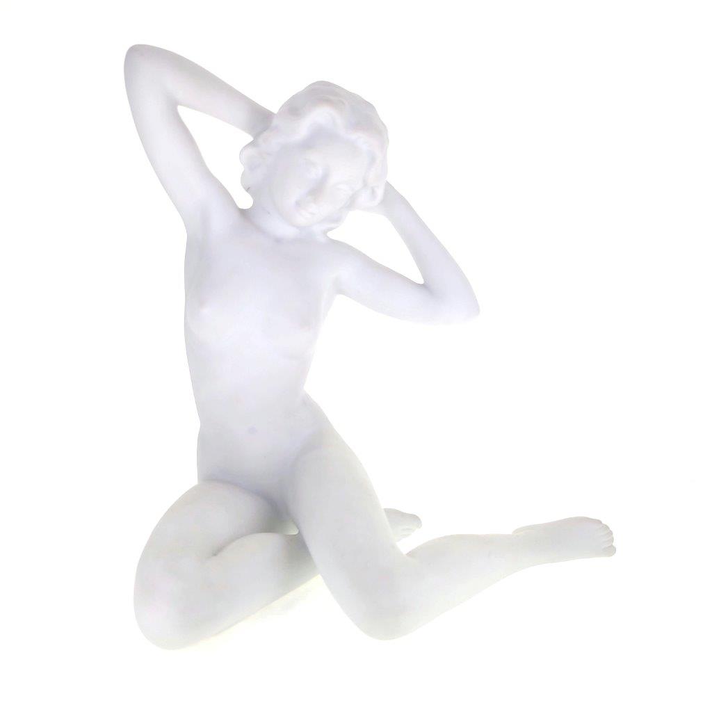 Popis: Nahá dáma v polosedě s rukami za hlavou, bílý porcelán biskvit, signováno: Bochmann, číslo modelu 278