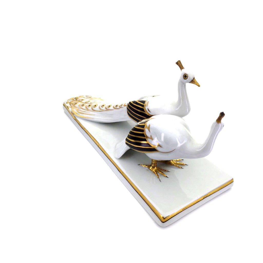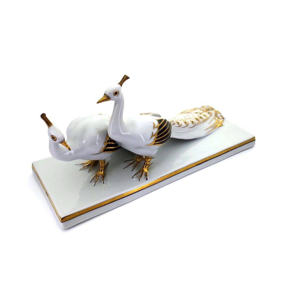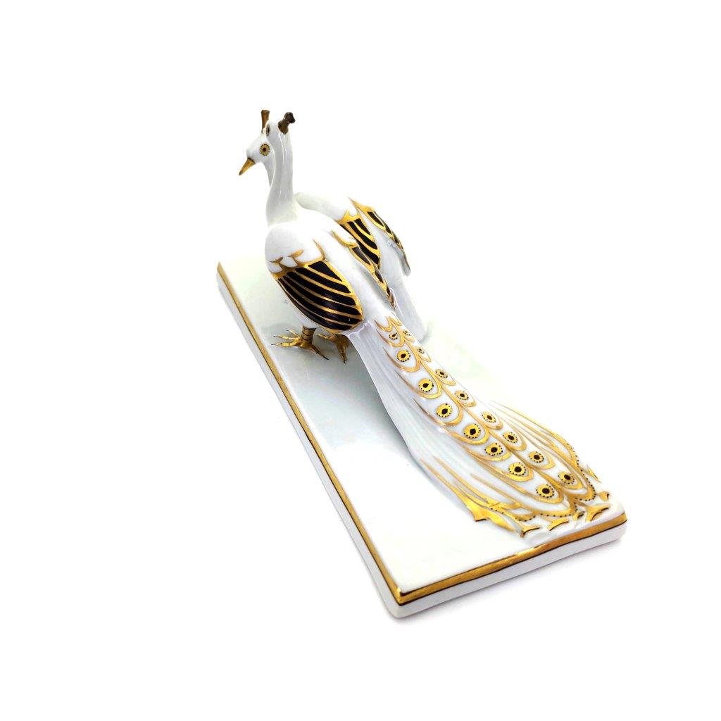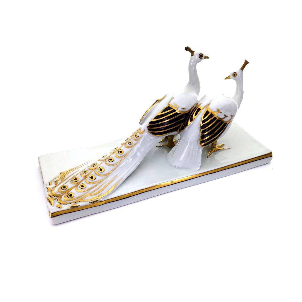 Popis: Páv s pávicí ve stylu Art deco, bílý porcelán s glazurou a zlacením v kombinaci s černou, číslo modelu 747