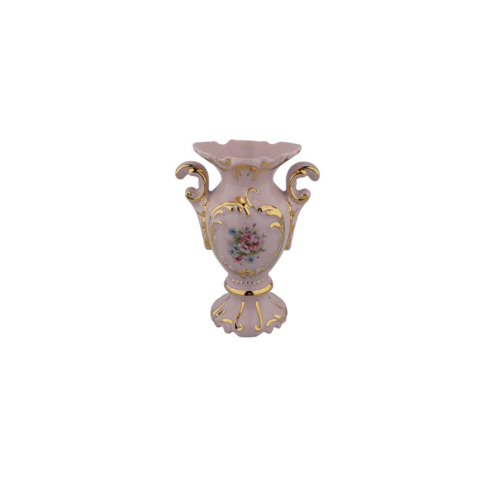 Popis: Malá amforka, porcelán s růžovou glazurou, květinovým dekorem a zlacením