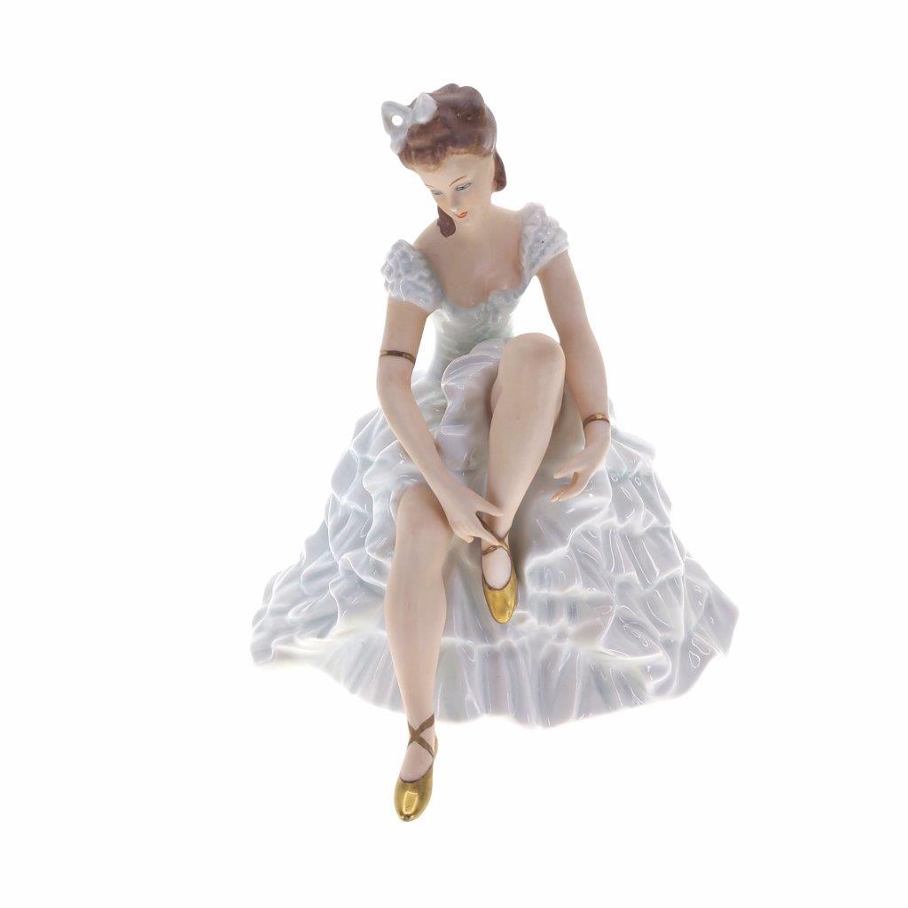 Popis: Balerína, která si zavazuje piškoty, biskvit v kombinaci s naglazurovými barvami a zlacením, číslo modelu 1318/o