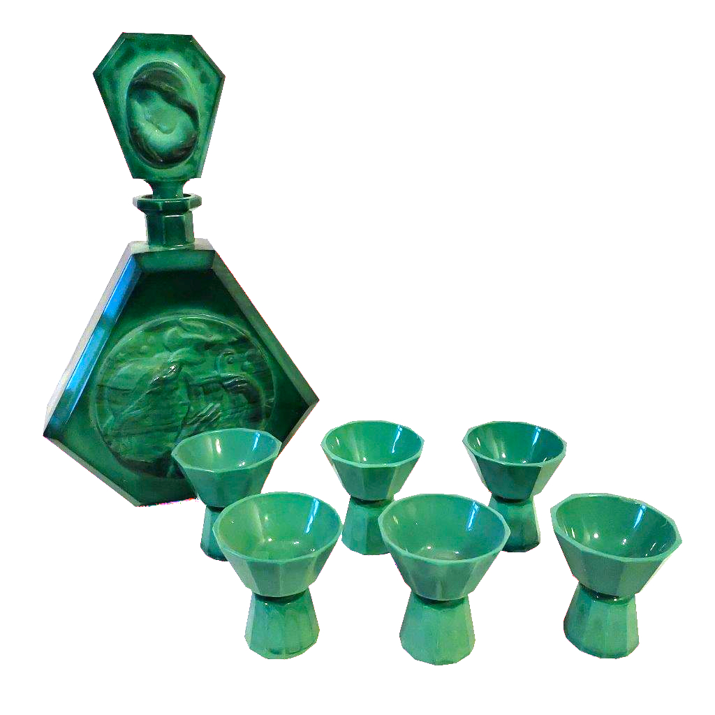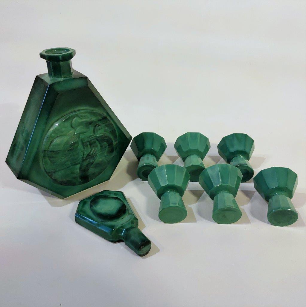 Likérová souprava z malachitového skla, Curt Schlevogt, nepatrné poškození