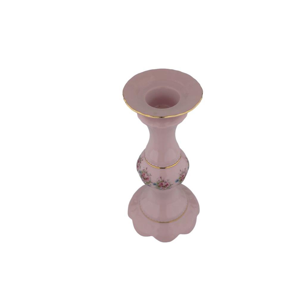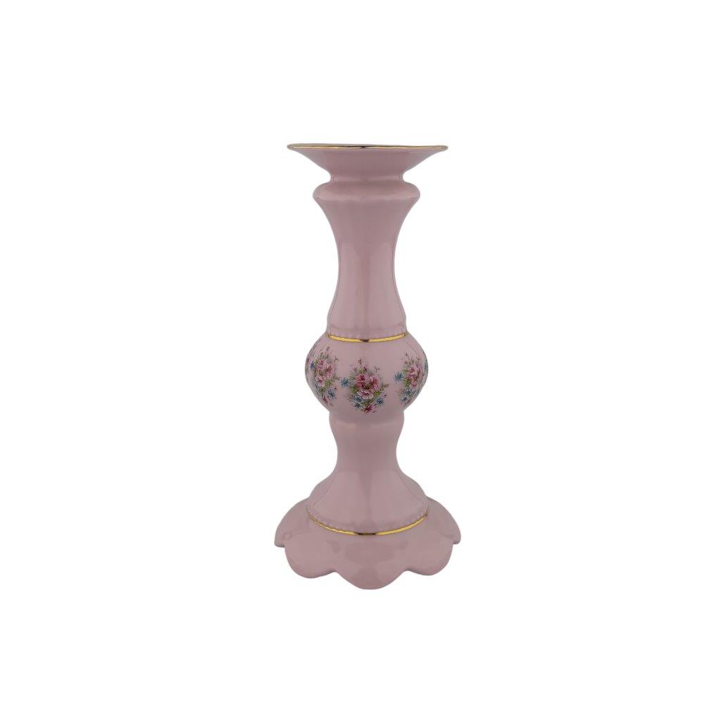 Popis: Svícen s květinovým motivem a zlacením, růžový porcelán