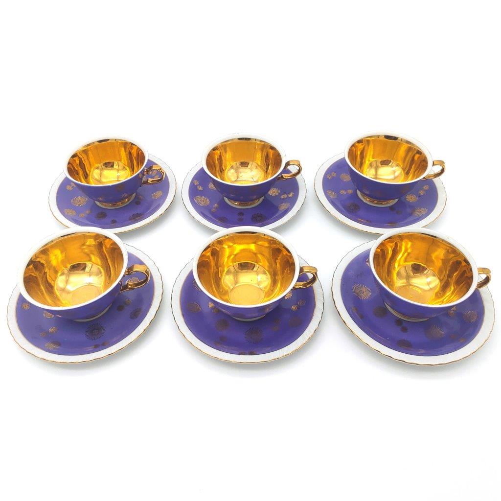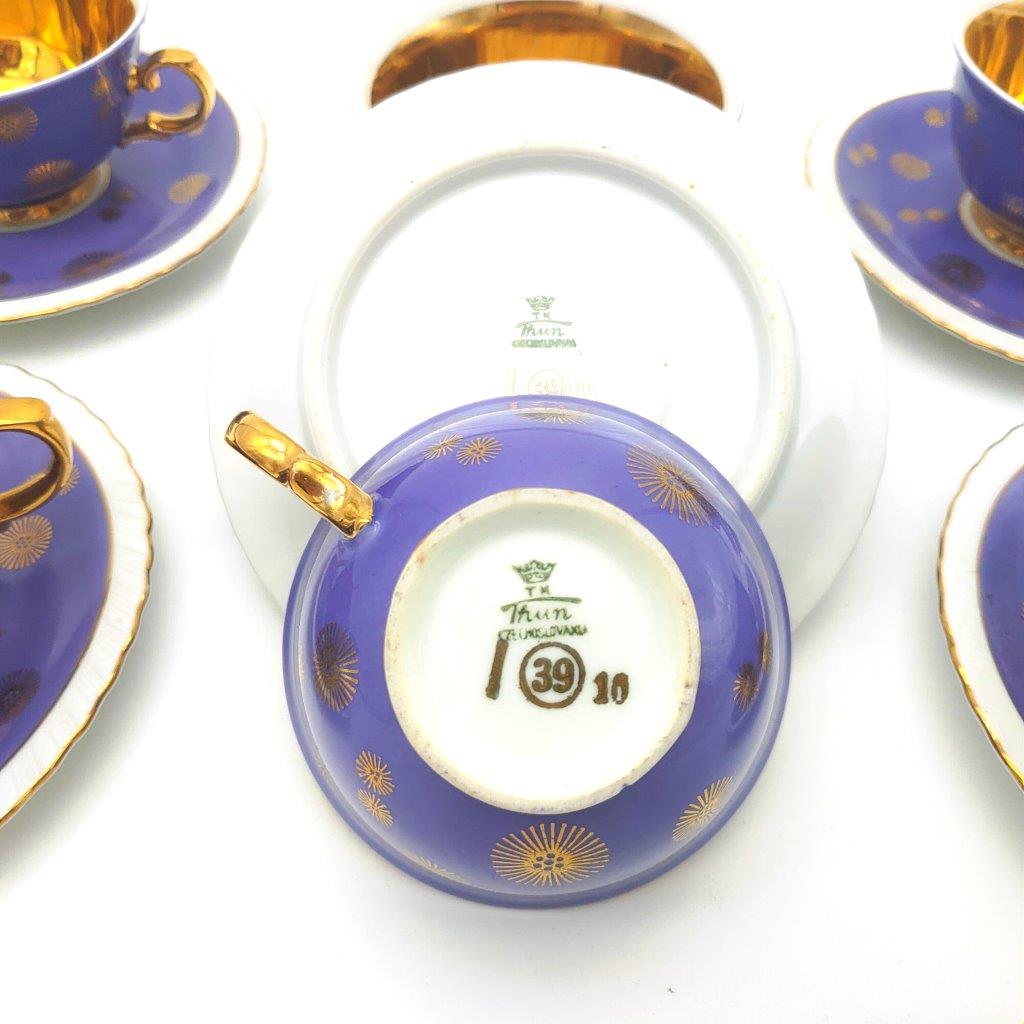 Popis: Souprava na čaj, fialová glazura se zlatým dekorem a lemováním. Obsahuje šest šálků a šest podšálků