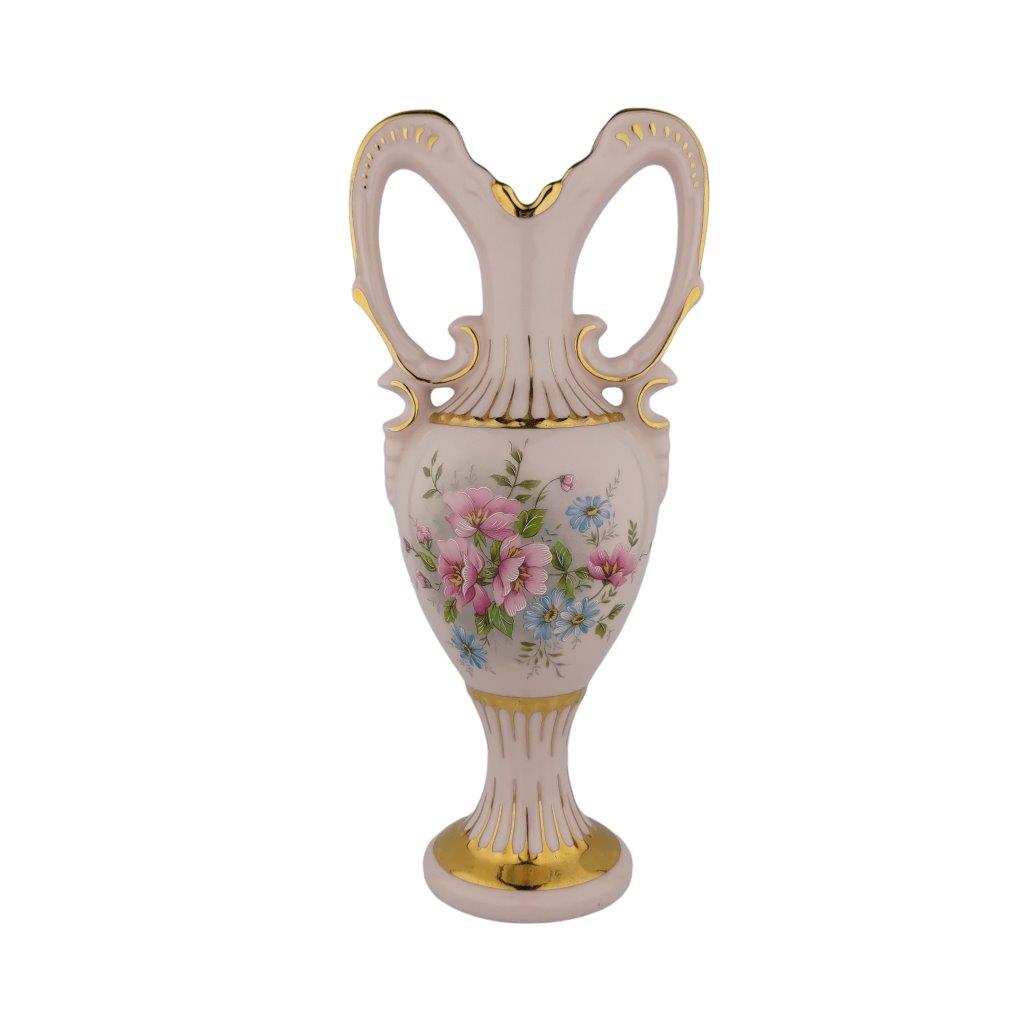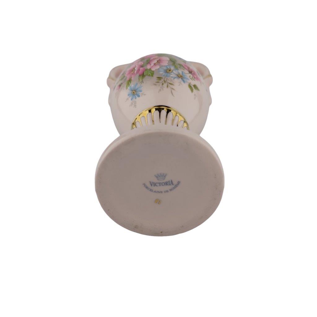 Popis: Amfora s uchy, růžový porcelán s květinovým dekorem a zlacením
