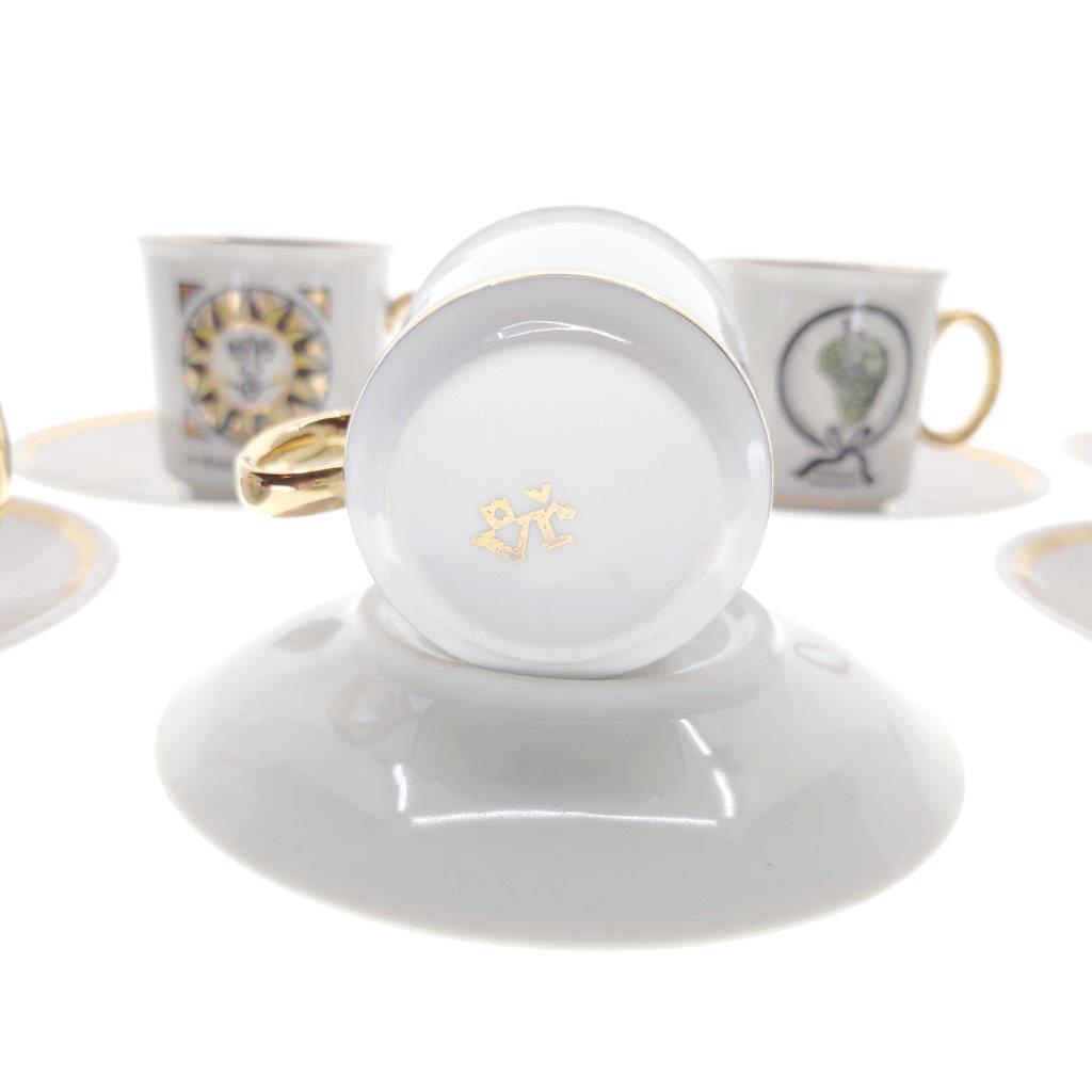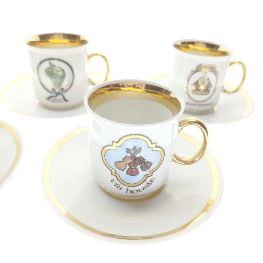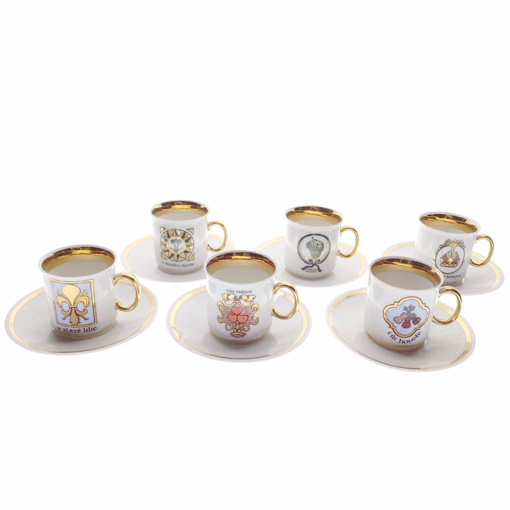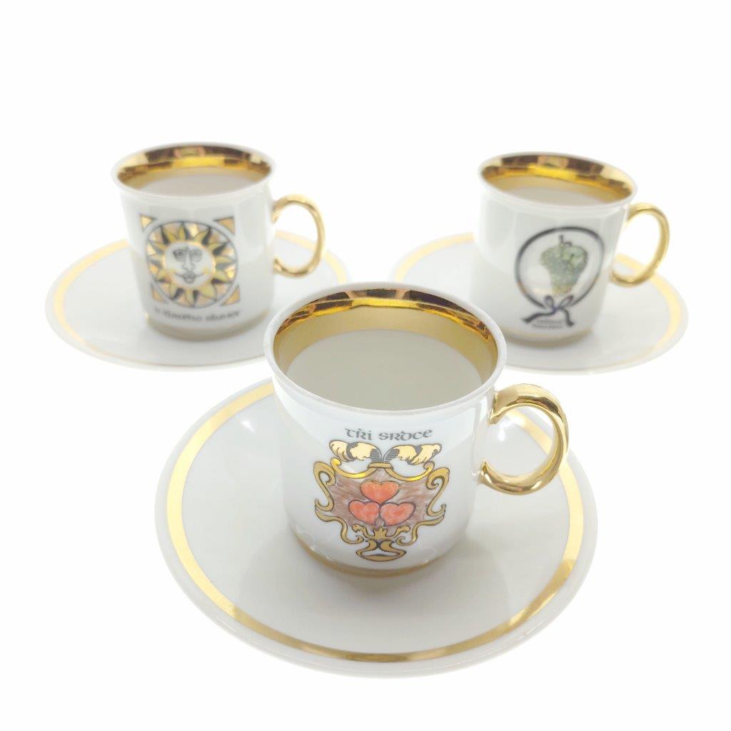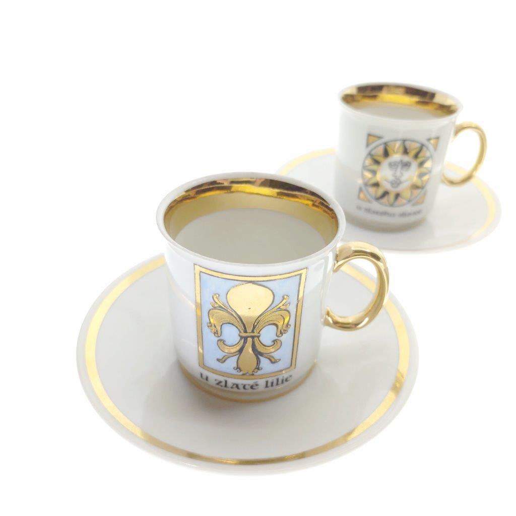 Popis: Originální souprava kávová na espresso se zlacením a motivem erbů: U zlaté lilie, Tři srdce, Tři housle, U zlatého slunce, Zelený hrozen a U zlaté koruny. Obsahuje šest šálků a šest podšálků. V 50. a 60. letech se výrobky Karlovarského porcelánu dodávaly do uměleckých družstev, kde se následně dokončovaly vlastním dekorem.